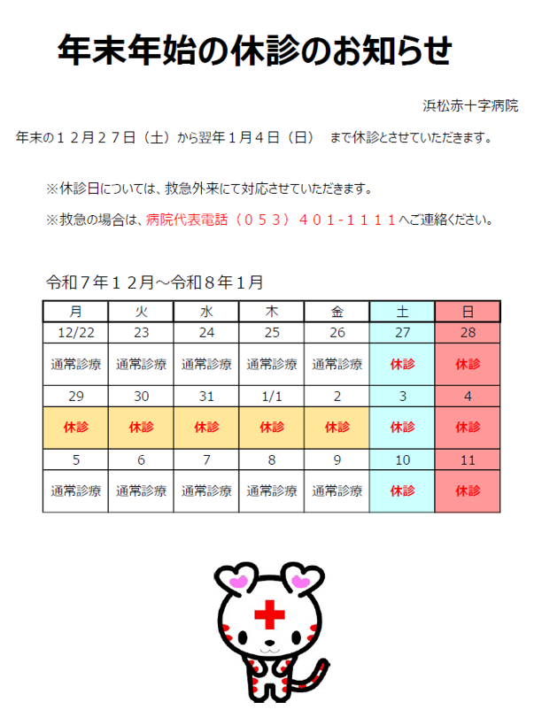 令和7年の年末年始における診療体制について 当院は、令和7年12月27日(土)~ 令和7年1月4日(日)の間、年末年始により休診とさせていただきます。 お飲みになっているお薬などの残量をご確認ください。 救急外来受診の際は、事前にお問い合わせいただきますようお願いいたします。 令和7年 年末年始の診療体制について